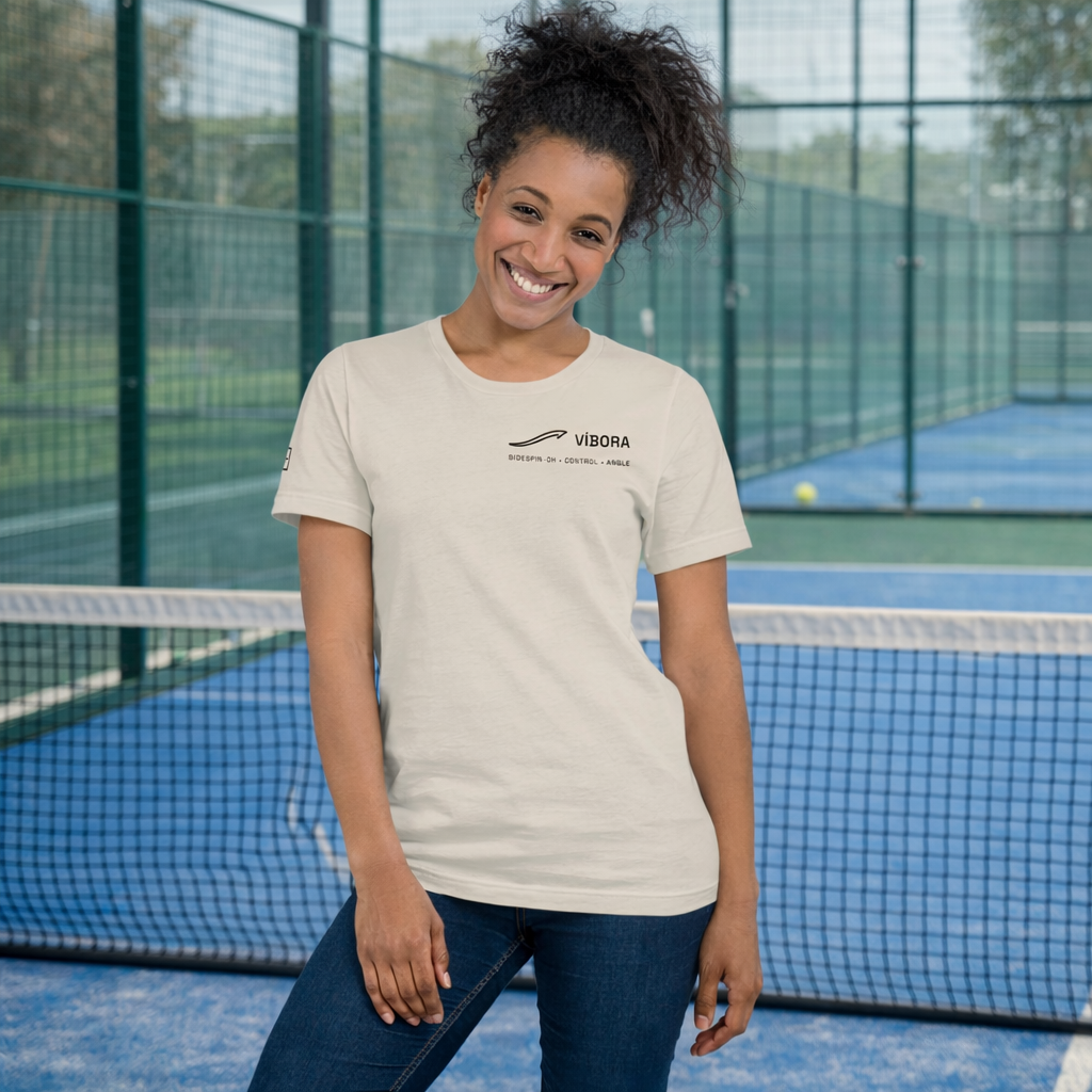 A víbora is padel’s faster, more biting overhead — driven with sidespin to keep the ball low, skid off the glass, and pull opponents out of position. It’s not about brute force. It’s about control, placement, and intent. This tee captures that feeling in a minimalist left-chest icon and a subtle insider reference. No loud graphics. No clichés. Just considered design.